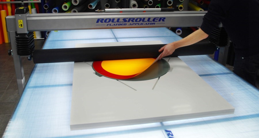 The jig has a start and stop space next to the sign to create a support for the pressurized roller.